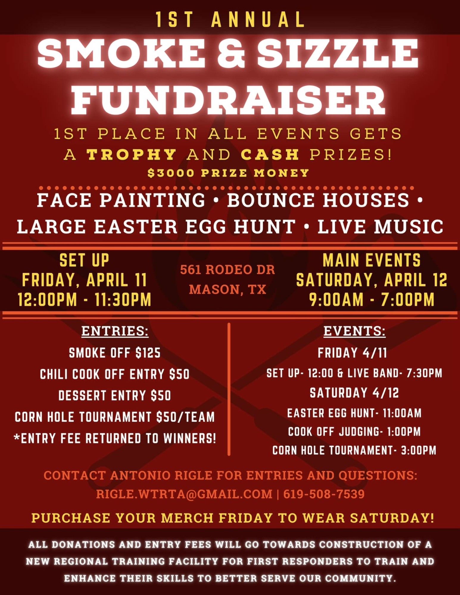 This is the 1st annual Smoke & Sizzle Fundraiser event that has been put together to help fundraise for construction of a new regional training facility for first responders to train and enhance their skills to better serve our community. All donations and entry fees will go towards this fundraiser!