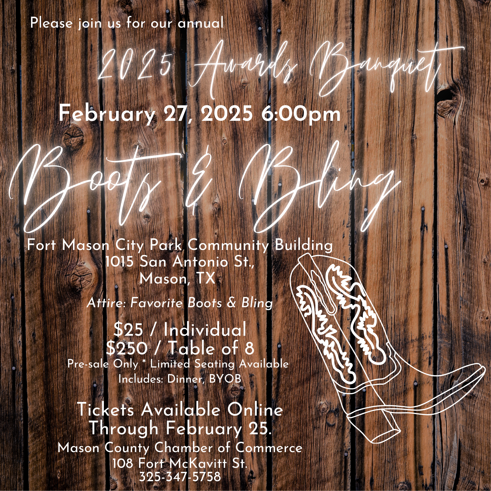The 2025 Mason County Chamber of Commerce Awards Banquet will be held Thursday, February 27th @ 6:00 P.M. at the Community Building. This is the Chamber’s opportunity to show their appreciation and to celebrate the past year with our members and community! Click register now top right to purchase tickets/ tables.