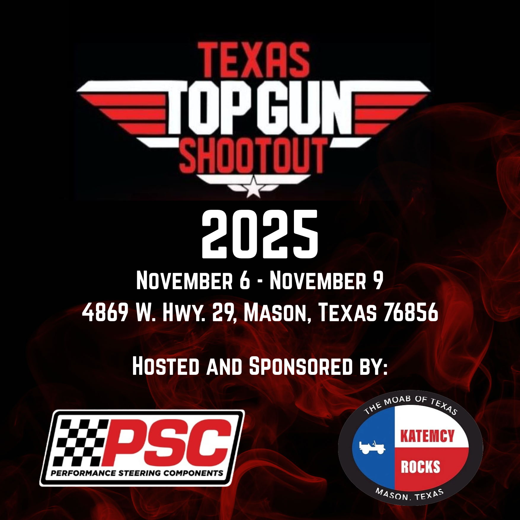 Texas Top Gun 2025 is coming! Bigger and badder than before! This will be the 4th year of the ultimate rockcrawling test to see who is really the Top Gun in rockcrawling! $10,000 first place prize money! Payouts for 2, 3, and 4th places. Two-day competition with an elimination round on Saturday, Day 1, and Finals on Sunday, Day 2. We will have a drag axle class on Day 1 if we have 10 competitors. Payout of $2,000 first place and payout of 2nd place if the class makes. We will also have open wheeling except in the comp area.