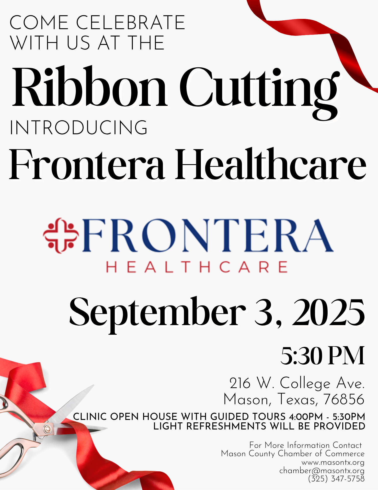 Please join us on September 3, 2025 from 4:00pm - 5:30pm as we celebrate the opening and ribbon cutting of Frontera Healthcare Clinic here in Mason! The ribbon cutting will be held at 5:30pm. Light refreshments will be provided and guided tours around the clinic! We look forward to seeing you all there!