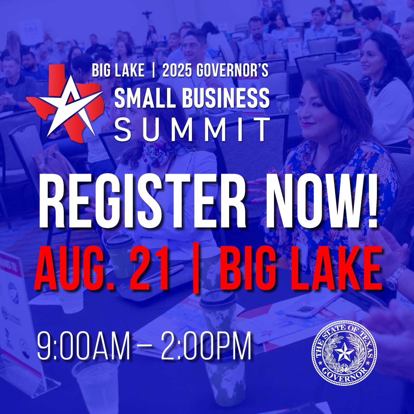 The Governor's Small Business Summit — Big Lake aims to help Texas small business owners and aspiring entrepreneurs reach new heights by connecting them with the resources and information needed to start, strengthen and grow a business. This event offers a variety of sessions bringing together local, state and federal resource partners to provide key insights on critical business topics. It's also an opportunity to network with other business owners and meet experts who will share timely, relevant and actionable advice on a multitude of small business subjects.