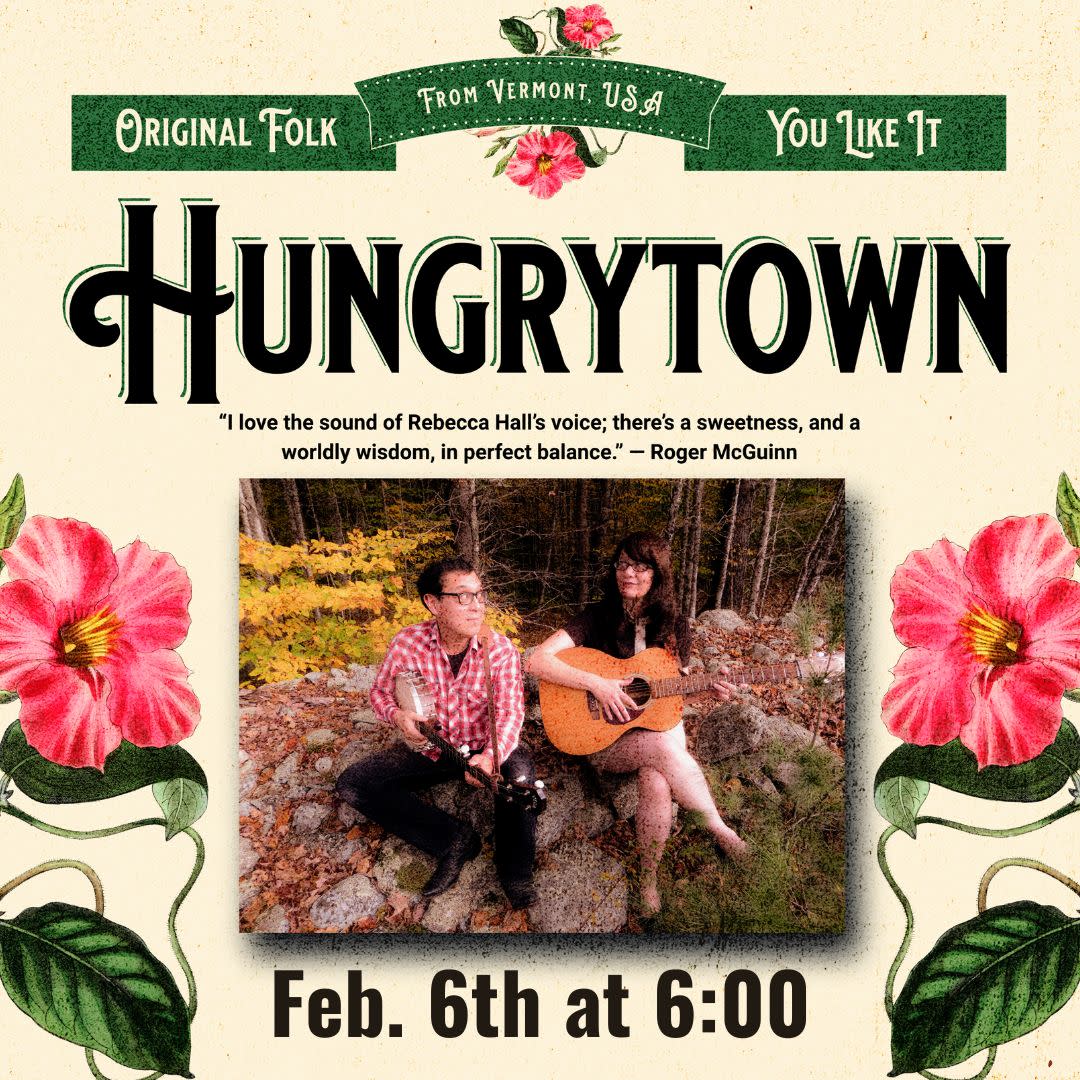 The couple continues to spend more than half of each year on the road, especially roads in North America, Europe, and New Zealand. Hungrytown's music has received extensive radio airplay worldwide and has appeared on several television shows, including Comedy Central's The Daily Show, IFC's Portlandia and Netflix's Lady Dynamite. The duo will perform at 6:00 on February 6th in the Stribling Room of the Mason County M. Beven Eckert Memorial Library. Adapted from hungrytown.com/about