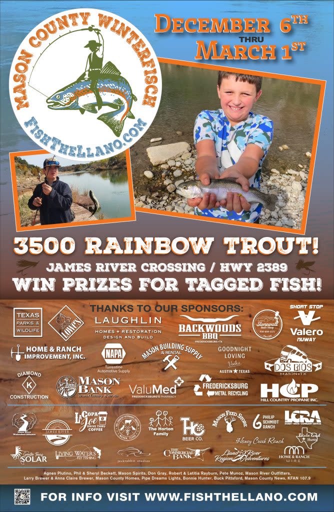 WinterFisch is a family-oriented recreational activity for Mason County residents and visitors during the slower winter months. WinterFisch is Mason County’s participation in the Texas Parks and Wildlife Department’s statewide Winter Rainbow Trout Fishing Program that occurs annually at over 200 locations across Texas. The WinterFisch trout fishing location is in Mason County 8 miles south of the town of Mason at the James River Crossing of the Llano River (Highway 2389). This site was chosen for its suitable trout habitat, and also for its ease of public access. A total of 2500 trout are released in two phases, one in early December and one in late January or early February of each year. Mason County WinterFisch also includes an opening day event the first Saturday in December called the WinterFisch Celebration, which celebrates this fishing opportunity, the Llano River, and outdoor recreation. The WinterFisch Celebration includes fishing instruction, loaner poles, fishing and outdoor demonstrations, campfires, live-music, and onsite cooking of caught fish. Throughout the season tagged trout are available for catching and the tags can be redeemed for a variety of great prizes. The season culminates with a grand prize drawing from all the tagged fish that were submitted.