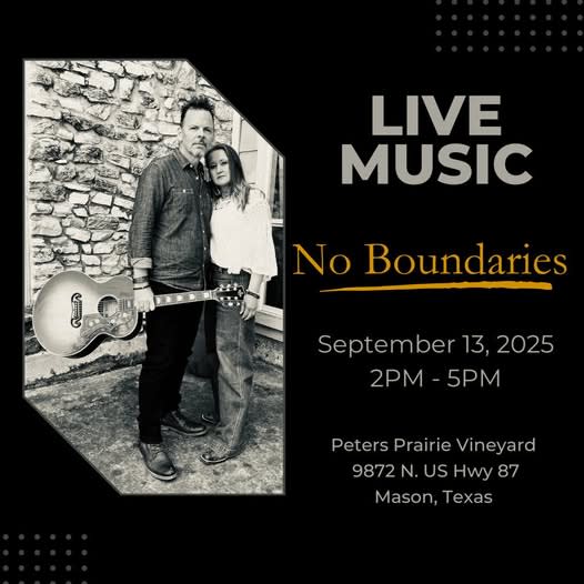Music, wine, and a scenic escape—don’t miss No Boundaries live this Saturday at Peters Prairie Vineyard!